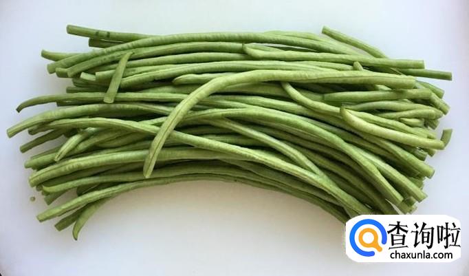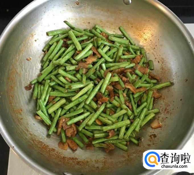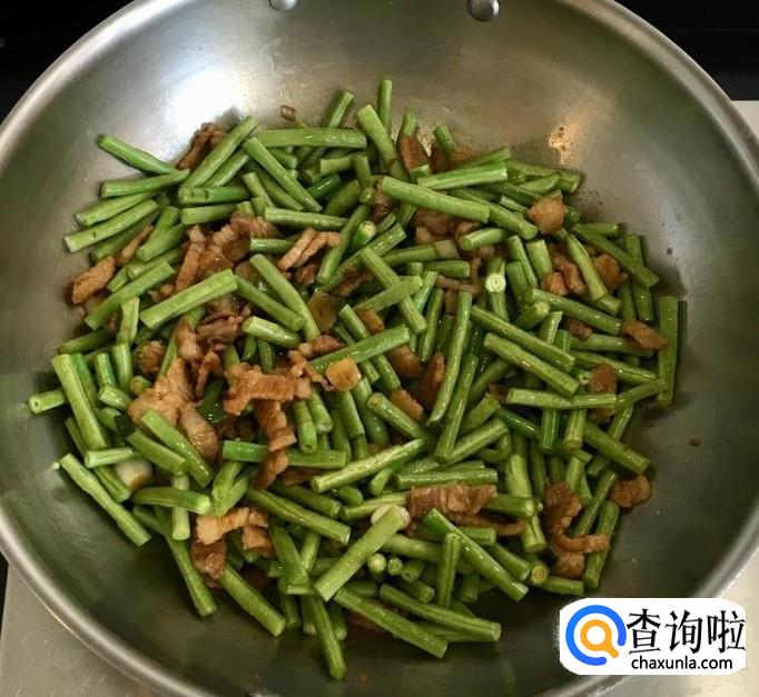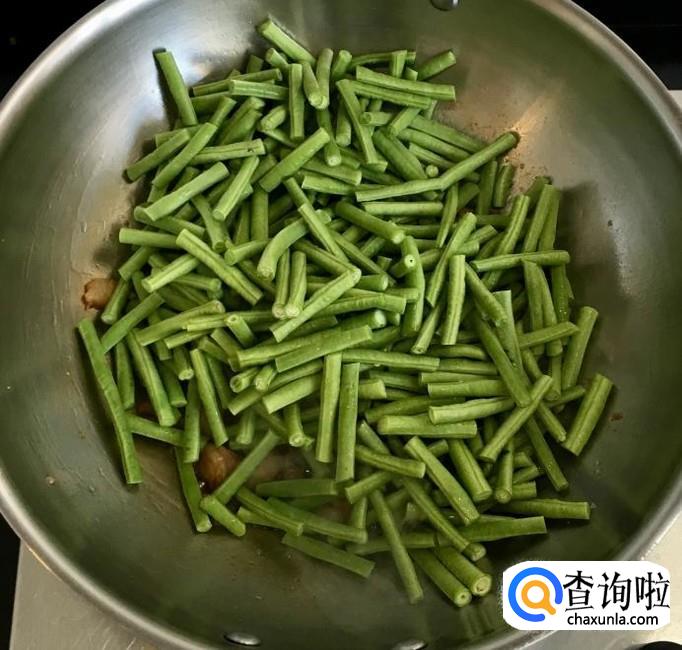 倒入切好的豇豆段改中小火翻炒均匀使之变色出水