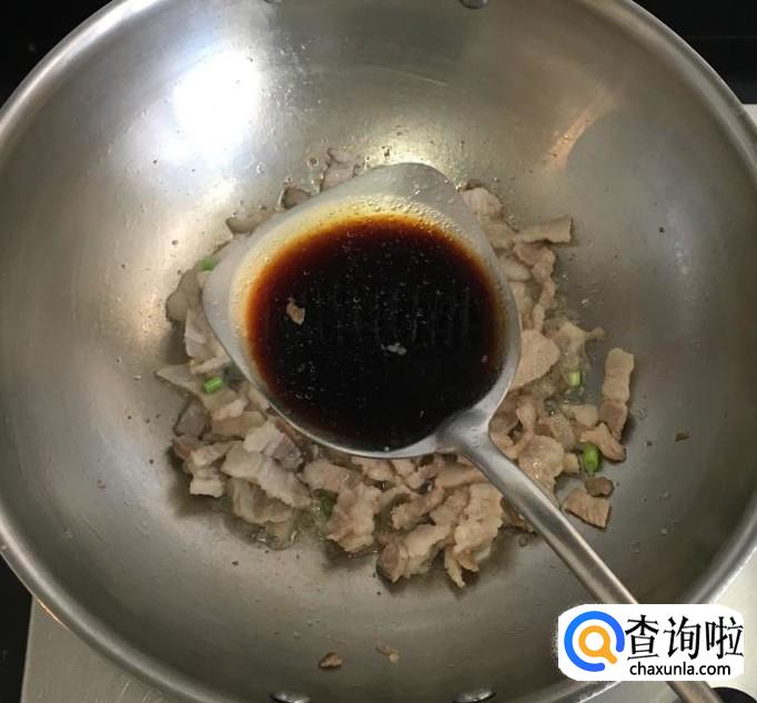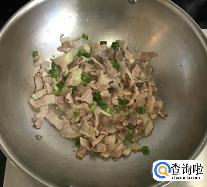 热锅加入适量的花生油放入五花肉片炒至变色后放入葱花、蒜片爆香,烹入适量的料酒和生抽翻炒均匀