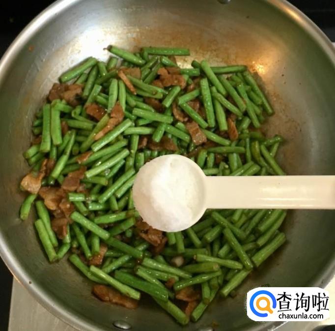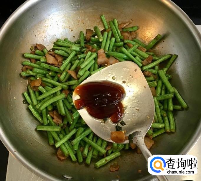 炒至豇豆角断生后加入适量的的蚝油和盐继续翻炒均匀