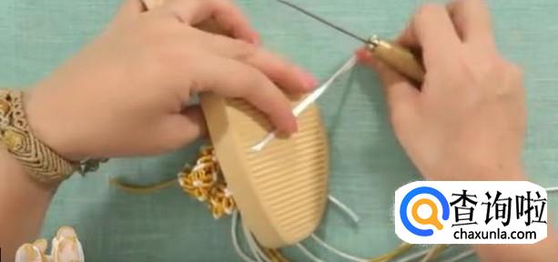第二部,打结。先把内侧的线打结,放在一边。中间白色芯线打一组平结。四根白线,对半分开。第一根作为轴线,黄色作为卷线,打第一组斜卷。第二组同样,重复多次直至结正好。这是完成的第一个单元花。以此进行第二个单元花。用同样的方法,把鞋面的长度编到12厘米。这里的长度是由脚背的高低来决定的。后面一排比前一排多打一个单元花。