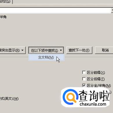 再点:特殊格式,弹出的列表中选择“任意字母”;在“在以下项中查找”选择:主文档