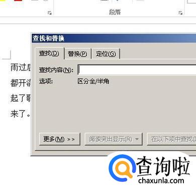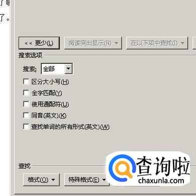 弹出一个查找的对话框;在框左边这里点击:更多(点了更多就变成了更少啦);下方即弹出相关内容。