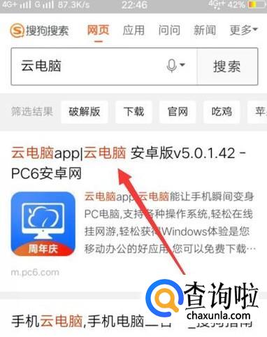 进入之后,搜索“云电脑”,点击图示连接将其下载并安装到手机上面,如图所示。