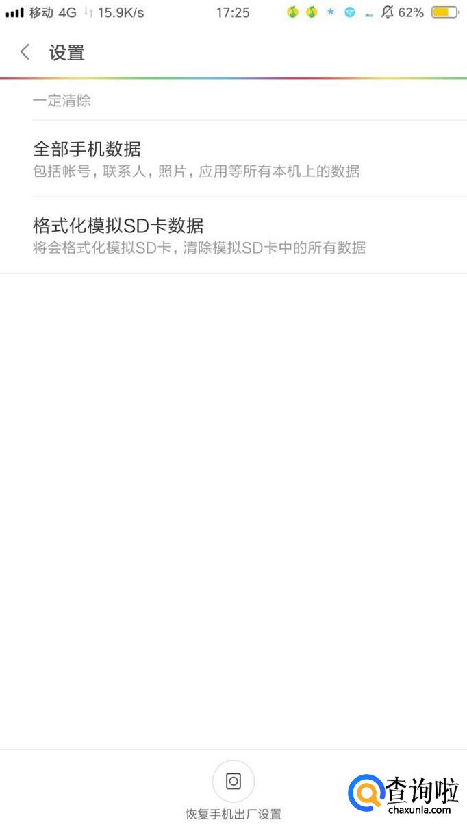 还有一种方法是进入recovery,选择"清除data","清楚数据"或者"格式化data"即可。