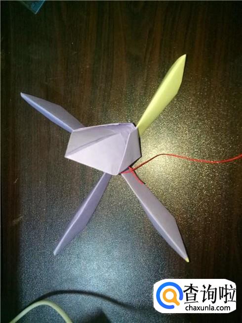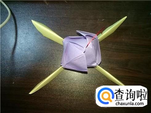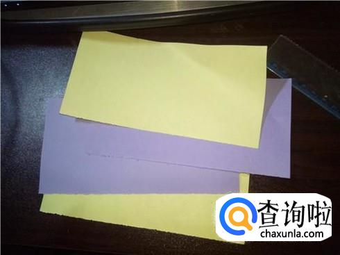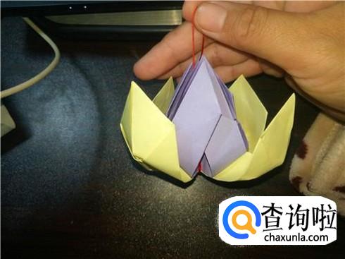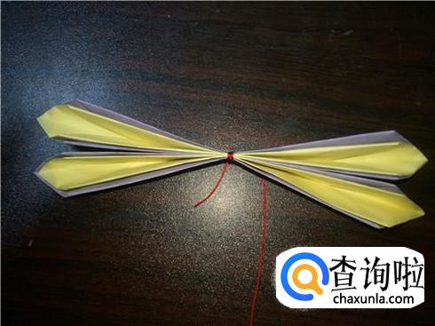 折叠完成后,把黄色的放到紫色的下面,沿中线弯折,然后把两份折纸用绳子在中间位置系紧。