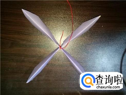 把系紧的折纸弯折成如下图所示的十字形。绳子的部分可以留长一些。