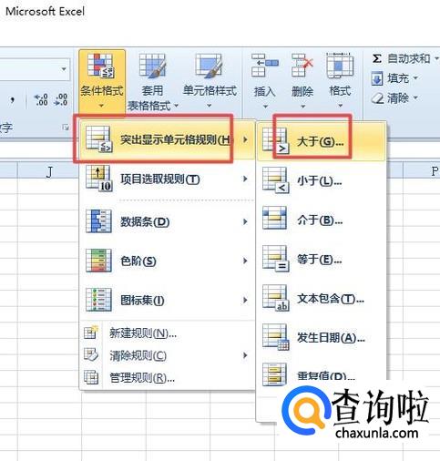弹出的界面,我们点击突出显示单元格规则,然后点击大于;