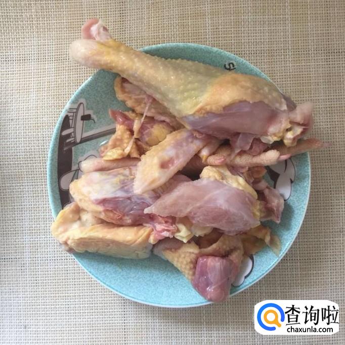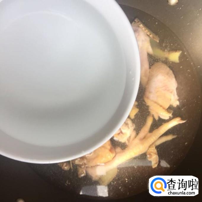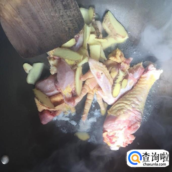 然后把鸡肉和生姜片一起倒入锅中,翻炒三分钟。