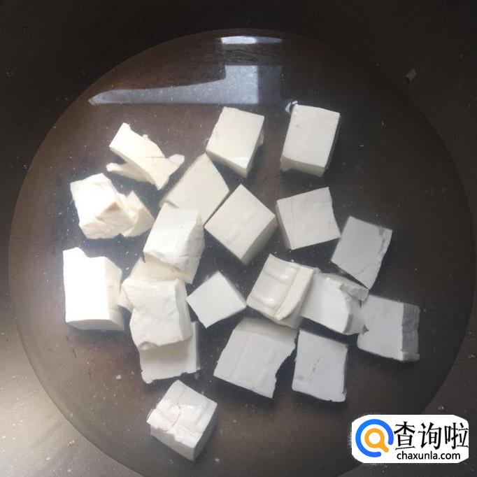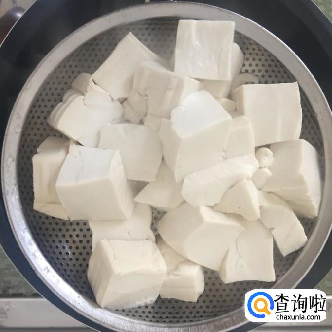 首先将买回来的豆腐切成小块用开水烫两分钟,捞出沥干。