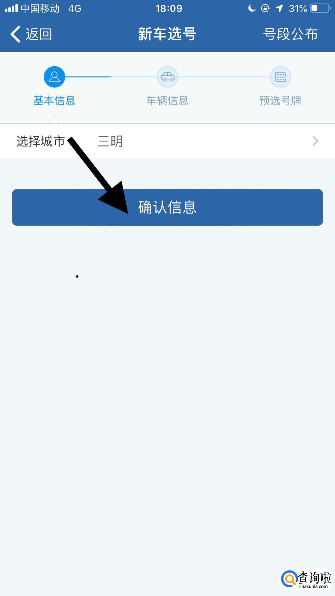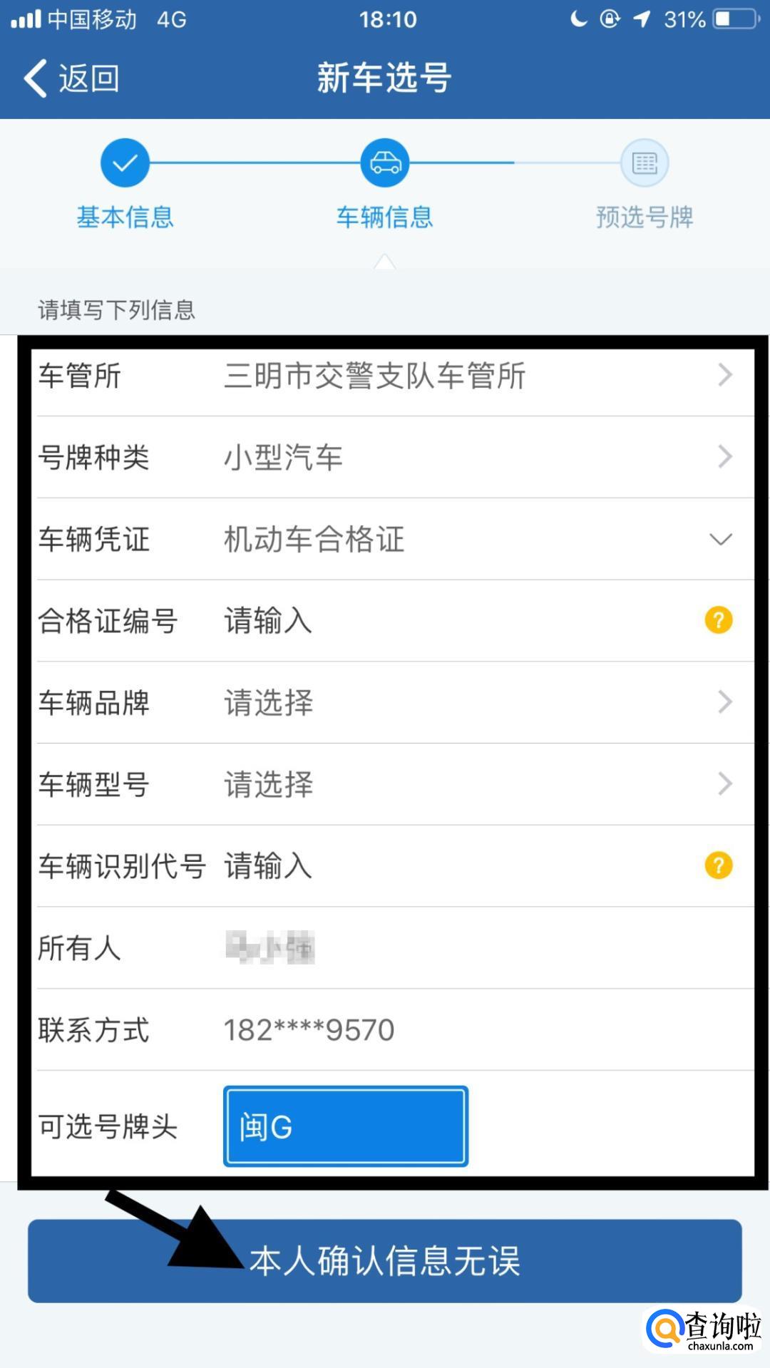 最后填写相关的资料并点击本人确认信息无误。进入下一个界面后就能够选择我们想要的新车号码了。