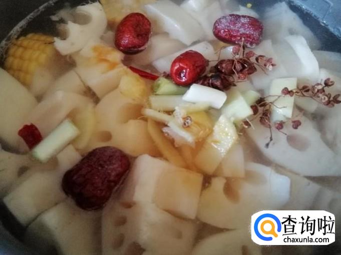 根据自己的口味,加入适量藕块还有鲜玉米块,红枣枸杞,再放入葱花姜片,八角花椒还有适量食盐。