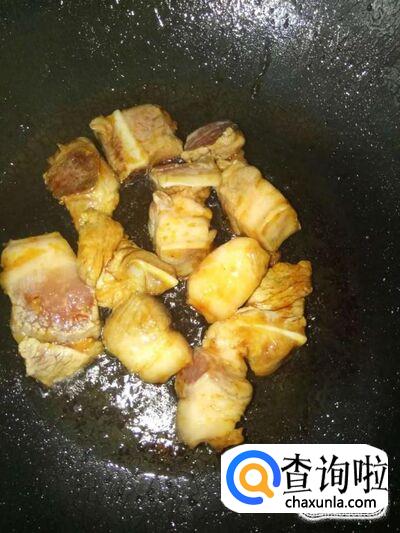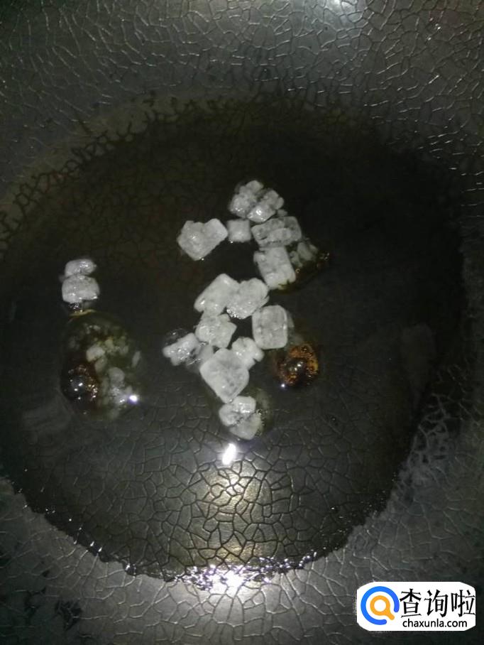 开火,锅里加入适量的食用油,油热后,将火调为中小火,取五六个冰糖下入锅里,炒匀;如果没有冰糖,用白砂糖也可以;
