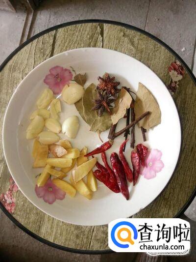 取适量的干红辣椒、八角、桂枝、香叶,洗净备用;