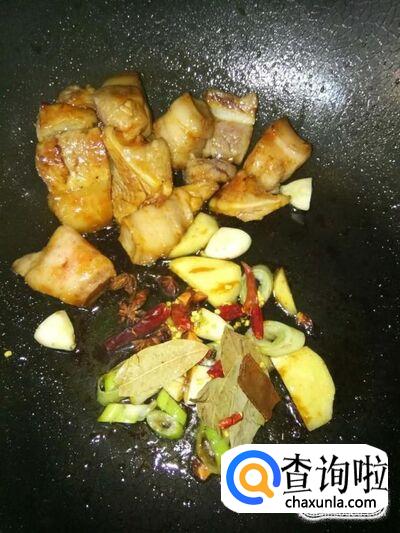 将五花肉拨到一边,下八角、桂枝、香叶、蒜头、姜片入锅里,翻炒出香味,再翻炒均匀;