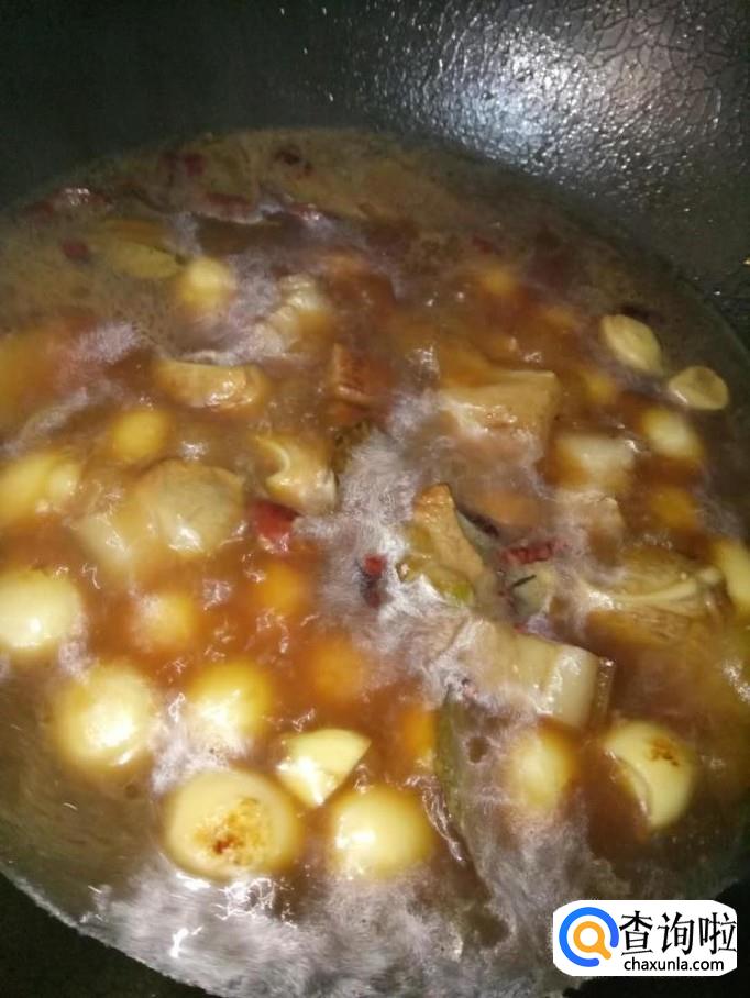 将鹌鹑蛋倒入锅里,加入适量的水将所有食材淹没,煮开;加入适量的生抽、料酒、老抽、蚝油,翻搅均匀,焖煮30分钟;加入适量的盐和鸡精调味好,再焖煮到收汁,即可。