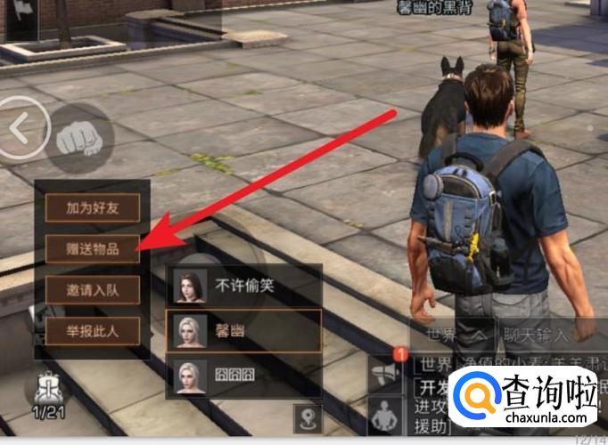 交易方式中,有赠送这个方式,先把伙伴叫到自己身边,然后选择这个位置,可以查看附近的人,然后选择伙伴,进行赠送。