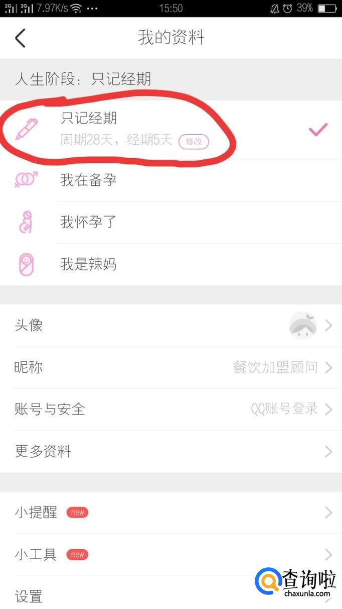 在我的资料页面中,找到人生阶段中的只记经期选项,点击修改。