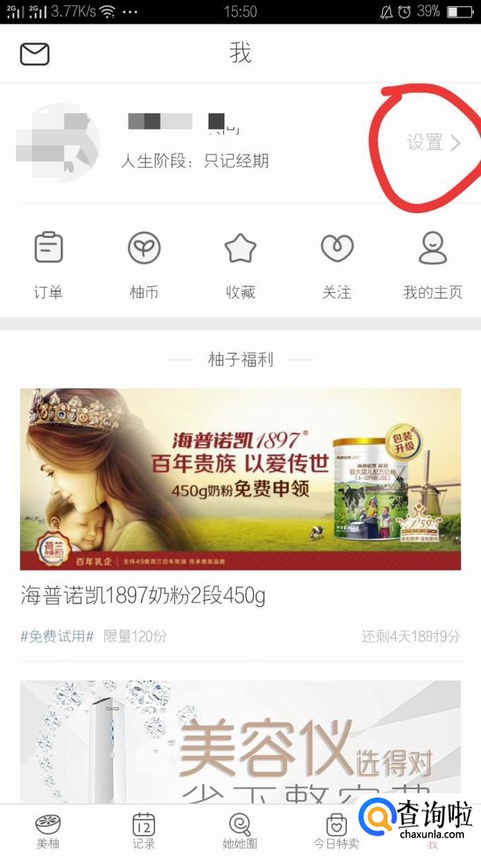登陆美柚账号之后,找到我的页面,然后找到设置功能,点击进入此操作。如下图红色标注内容所示。