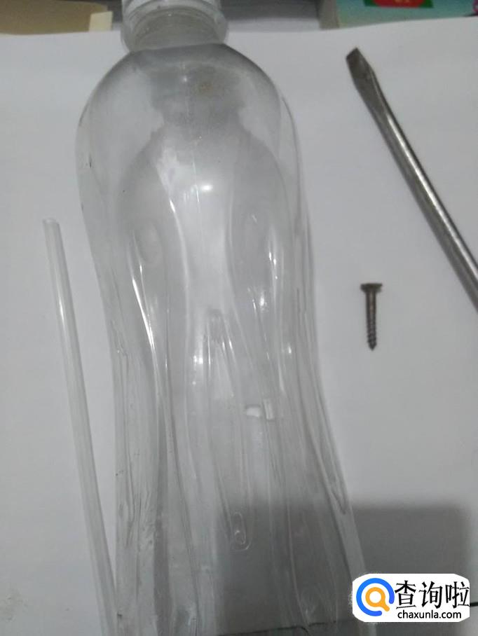 准备饮料瓶、螺钉、改锥和吸管。螺钉要和吸管差不多粗细。
