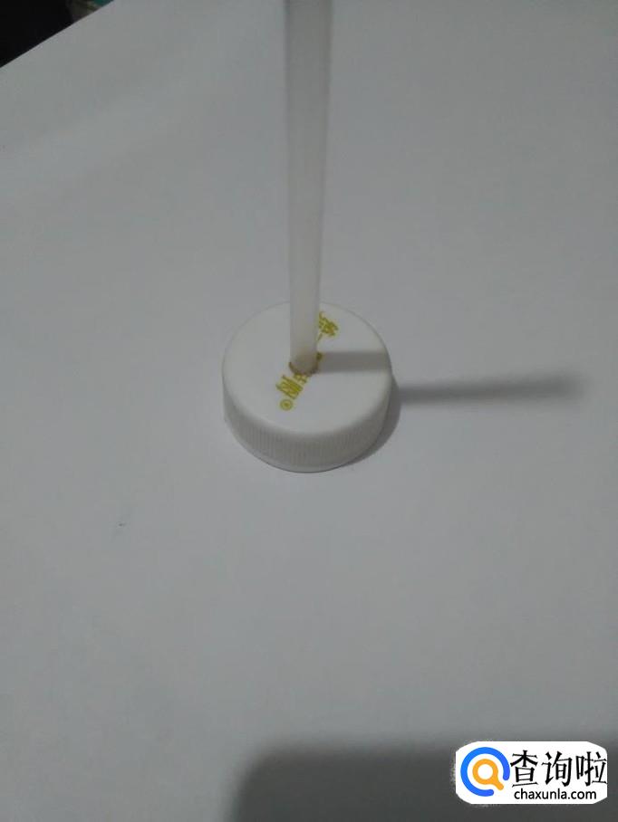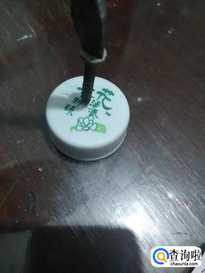 将饮料瓶的盖子先拧下来,把螺钉放在瓶盖中间,将改锥插在螺钉的钉帽中,用力拧,把瓶盖拧出一个洞来。