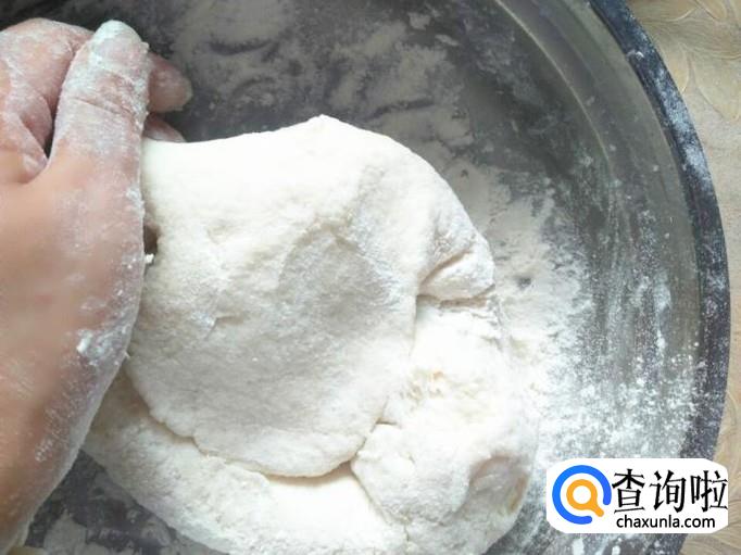 当烫面用筷子搅拌均匀之后,试探一下,不烫手的时候开始加一些面粉进去,然后不断的揉搓,记住了不要让面团很硬,烫面蒸饺的面一定要软。