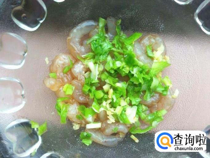 好了,现在咱们要调馅了,虾仁里面的姜丝和葱段全部挑出来,里面要是有汤汁的话倒掉,然后把姜末和葱末加进去。