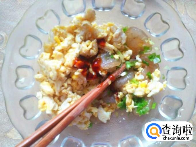 再将凉好的鸡蛋碎放进去,然后加入一点食盐,加入一点点生抽(可不加),倒入一些蚝油提提鲜,不用放任何其他调料了,放多了反而改了味道。另外说明一点,你要是喜欢吃韭菜,放一些韭菜末也会很好吃,我家言哥不喜欢吃韭菜,所以就不妨韭菜末了。