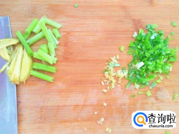 准备生姜和小葱,切一些姜丝和葱段,然后切一些生姜末和葱花待用。