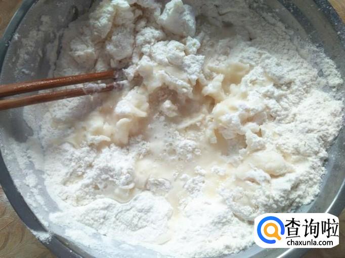 让鸡蛋碎先自己凉着,我们现在就要把烫面做好。面粉放进盆里,开水倒进去,记得用筷子快速划开,记得不要用手哈,我刚刚用手差点给我烫伤。一次别加太多开水,一边搅一边观察,不要和成稀泥呀各位。