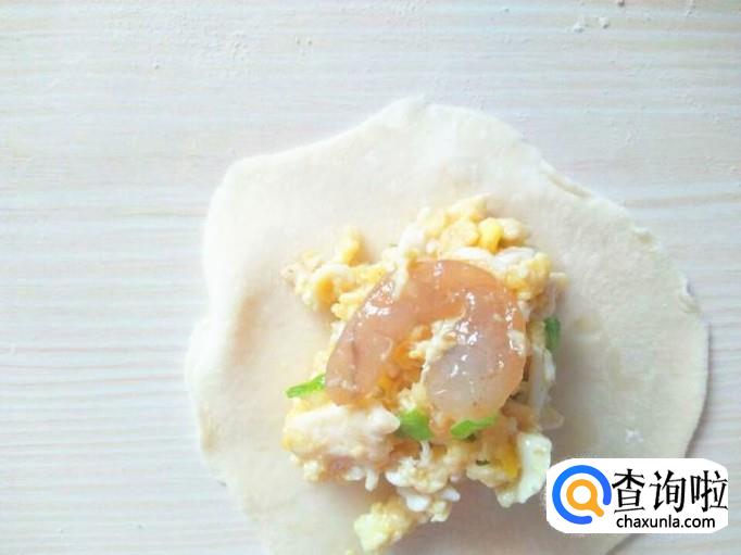 一个面皮一点馅,然后加上一两个虾仁,就像包饺子那样包起来捏好。