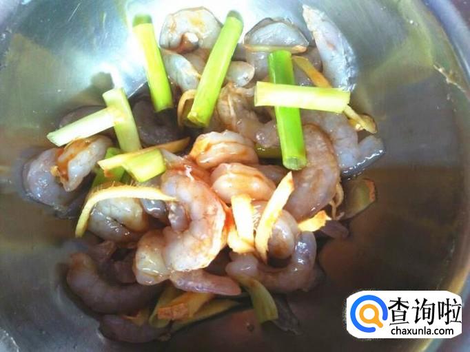 将刚刚切好的生姜丝和小葱段放进盛虾仁的碗里,加上一点食盐、一点点生抽和一半勺耗油,抓匀腌制二十分钟。