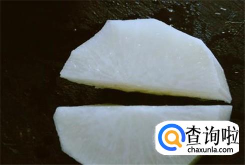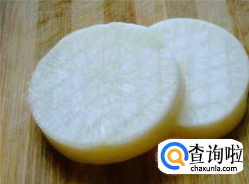 用刀将萝卜切成圆片,按照你想要的块状的粗细来切。