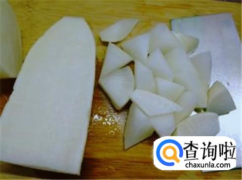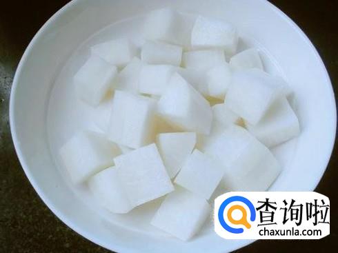 把切成圆片的萝卜横竖各切一刀,萝卜块出来了。其他萝卜直接全部切块就行,是不是很简单?