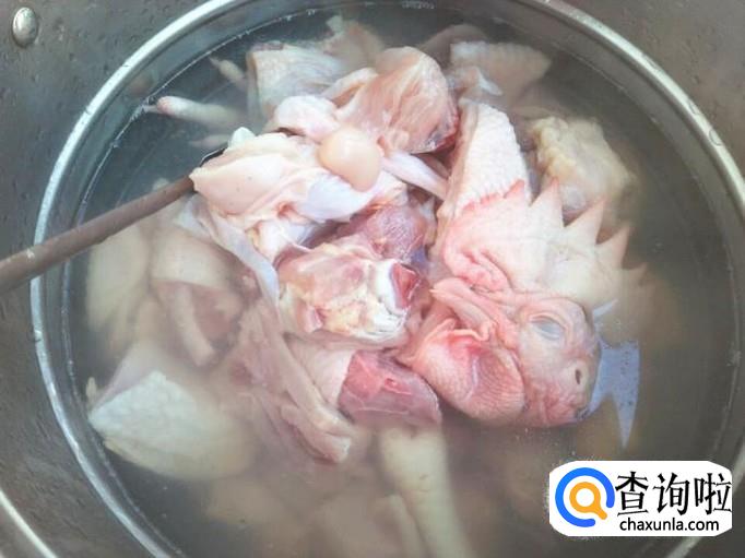 锅里烧开一锅水,把鸡肉放进去焯一下,鸡肉变得发白的时候捞出来,放进冷水里浸泡五分钟,然后冲洗干净控干水分。