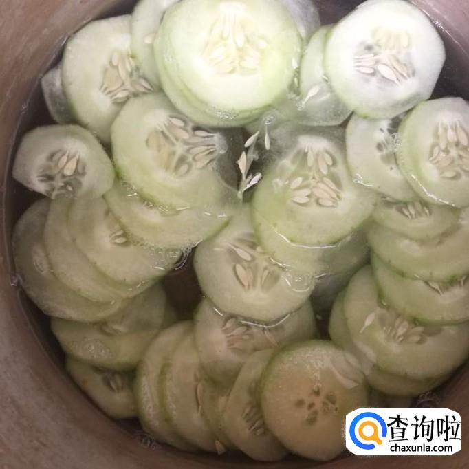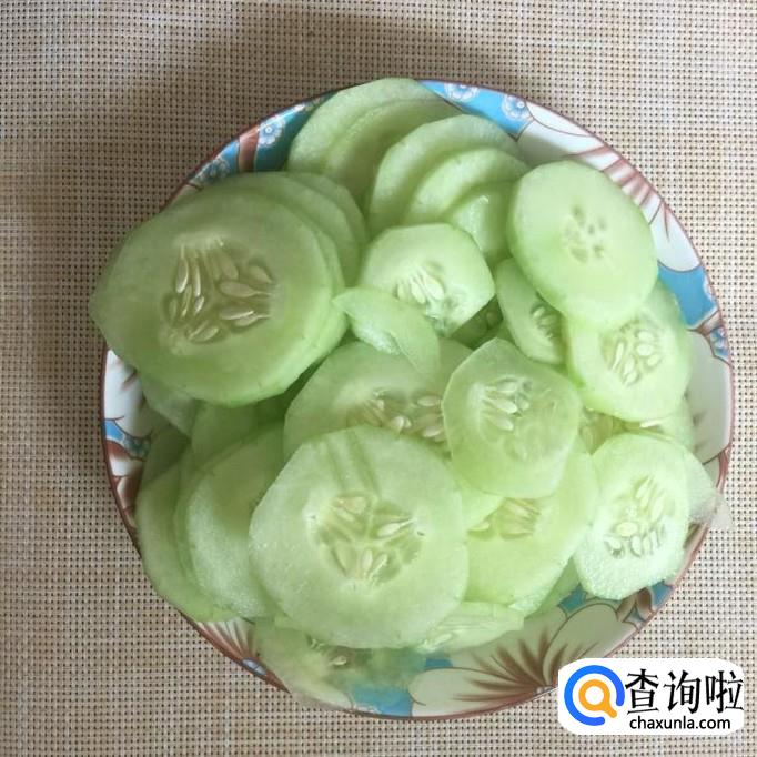首先将黄瓜去皮,切成薄片,如下图所示。