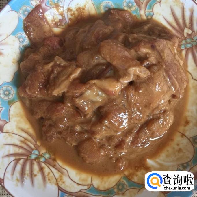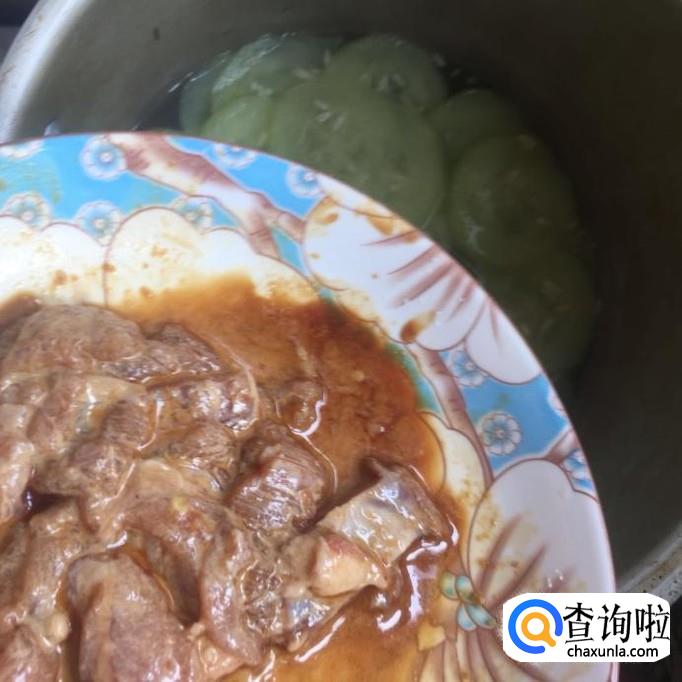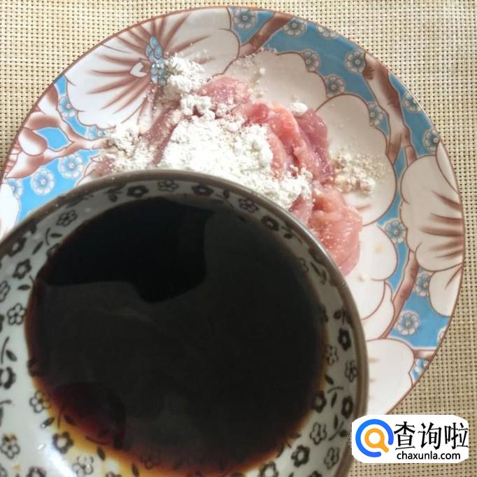 接着把瘦肉切成薄片,并用适量的地瓜粉和酱油裹一下,如下图所示。