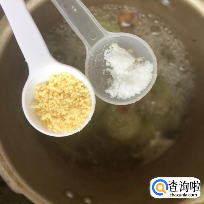 接着往锅中加入适量的盐巴和味精,如下图所示。