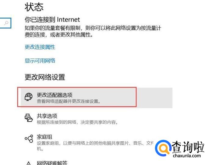 在接下来打开的页面中,我们选择“更改适配器选项”菜单。