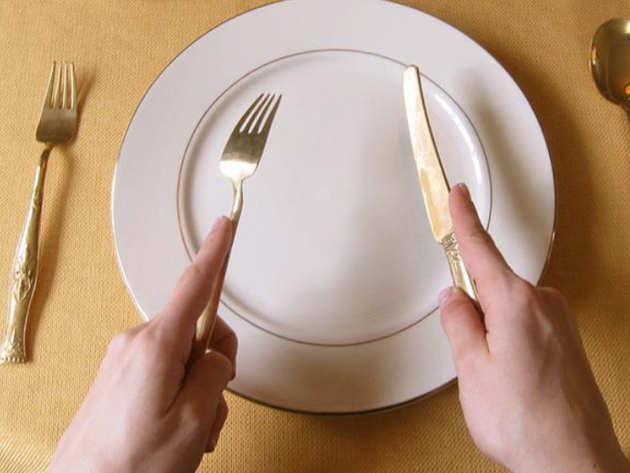 第3步:将餐叉换到右手。切好一小块食物之后,将餐刀放在盘子的右侧(将餐刀稍稍倾斜,刀叶在对准12点钟方向,手柄对准3点钟方向)。把餐叉换到右手,餐叉茧绸朝上,将食物送入口中。
