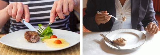 第2步:切割食物。左手持叉,右手持刀,从左侧开始切割食物。切割食物的动作和欧式一样。