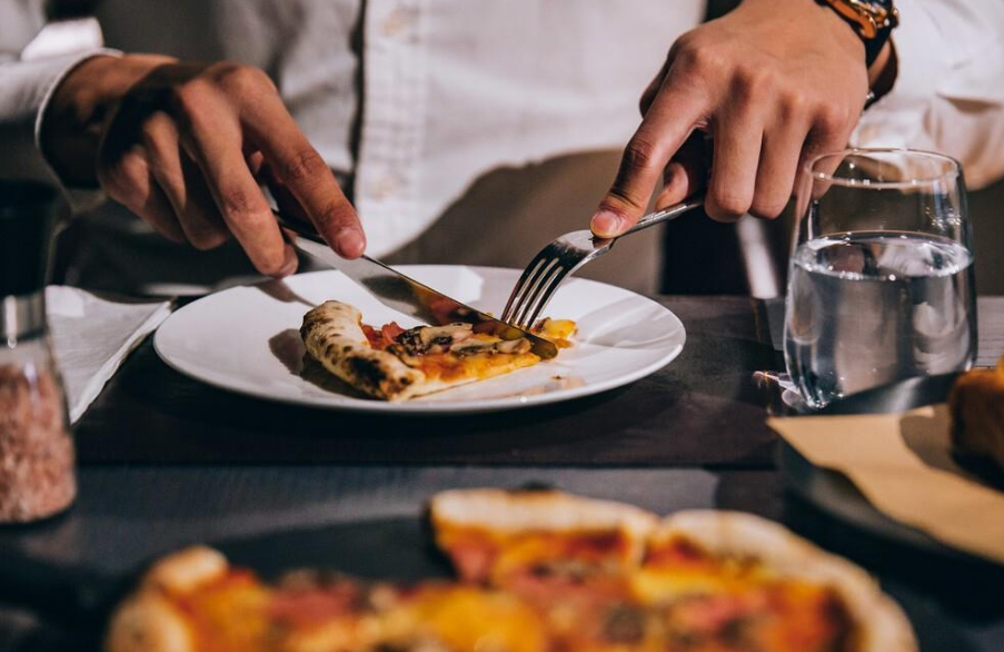 第4步:把餐叉换回左手。吃完一小口食物后,将餐叉换回左手,然后右手拿起餐刀,再切下一口要吃的食物,如此循环往复。