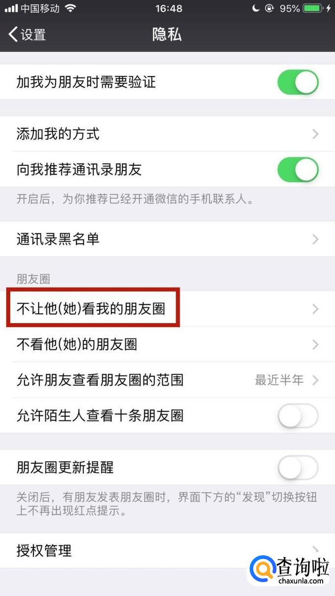 接着点击不让他(她)看我的朋友圈,如下图所示。