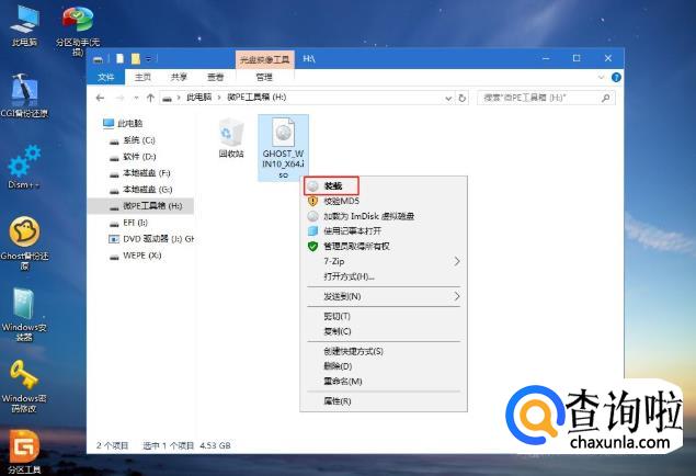 接着打开此电脑—微PE工具箱,右键点击win10系统iso镜像,选择【装载】,如果没有装载,右键—打开方式—资源管理器。