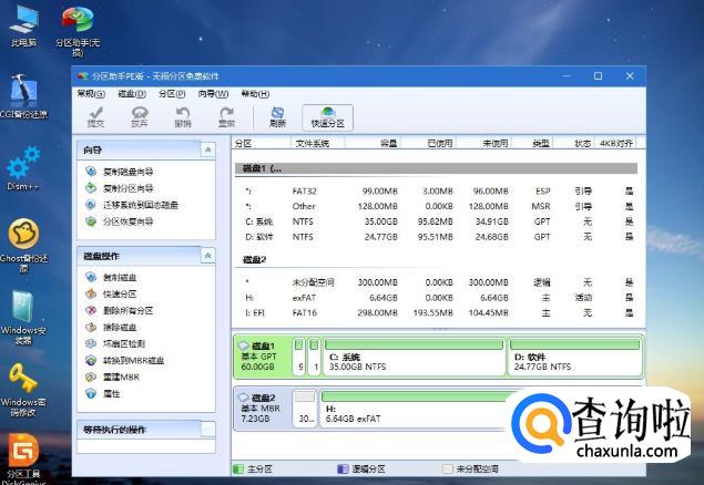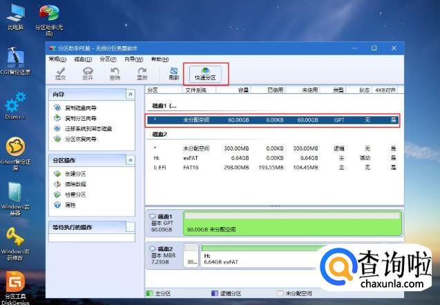 进入到pe之后,双击桌面上的【分区助手(无损)】,选择磁盘1,点击【快速分区】,如果你是2个硬盘,要选对,不要误删。