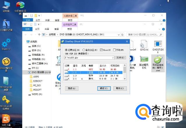 双击【双击安装系统.exe】,运行安装工具,选择【还原分区】,GHO WIM ISO映像路径会自动提取到win10.gho,接着选择安装位置,一般是C盘,或者根据卷标或总大小来判断,选择之后,点击确定。