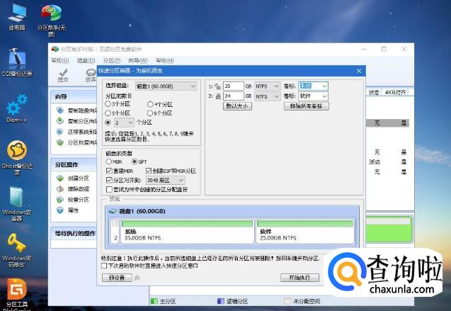 设置分区数目、分区大小以及分区类型,卷标为【系统】的系统盘建议60G以上,由于选择了UEFI启动,磁盘类型要选择GPT,【分区对齐到】是4k对齐,2048扇区就行,也可以4096扇区,确认无误后点击开始执行。