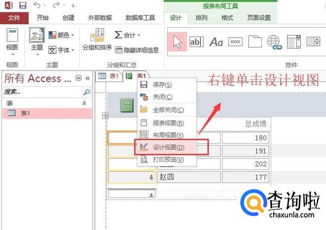 进入到报表设计界面以后,右键单击表一页卡名,在下拉菜单中选择设计视图,如下图所示
