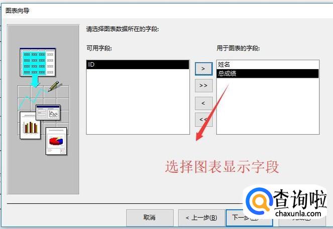 然后需要选择报表中显示的字段,我们将姓名和成绩两个字段添加进去,如下图所示