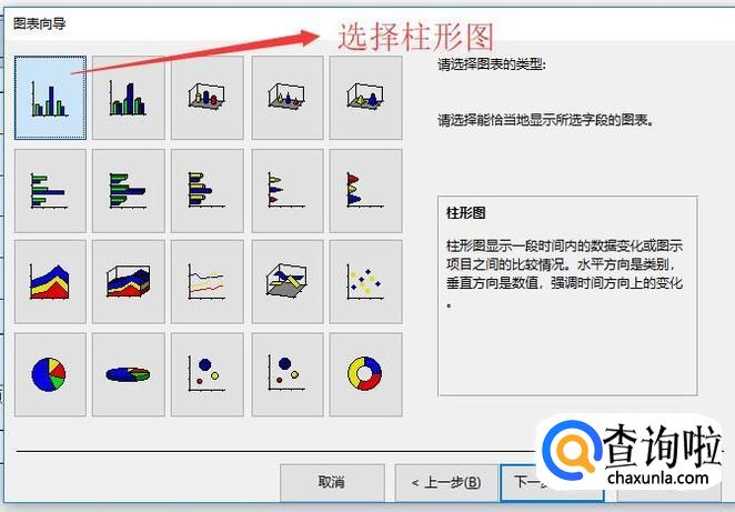 接下来在图表类型界面中选择第一个柱形图,然后点击下一步按钮,如下图所示