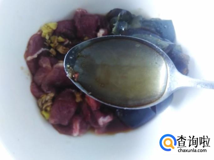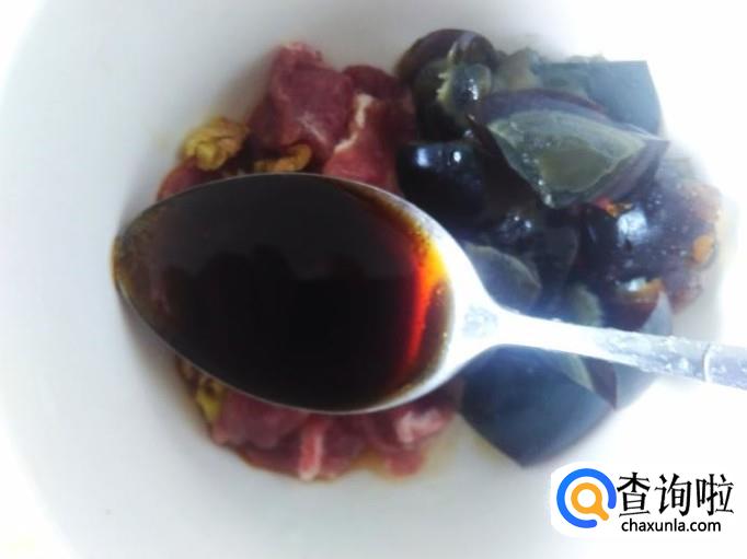 瘦肉和皮蛋混合一起,加适量的盐、姜蓉、1勺生抽、1勺料酒、2勺香油搅拌均匀。